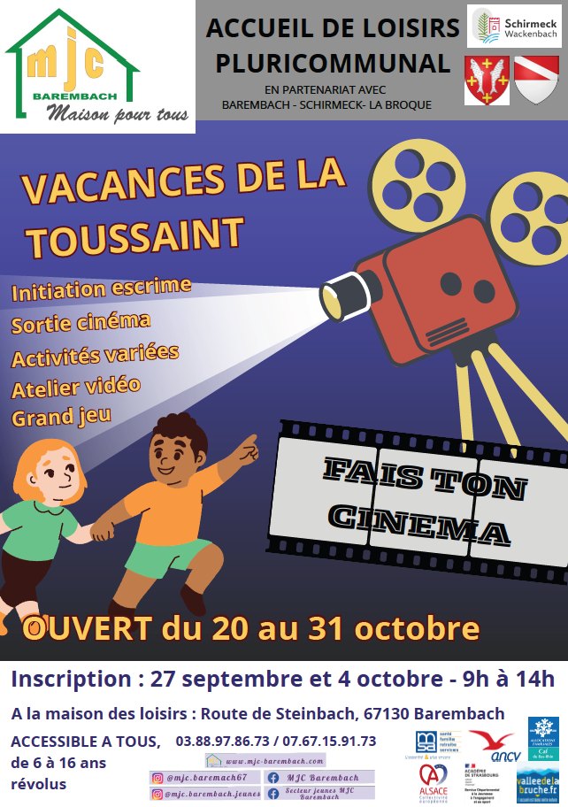 Les vacances de la Toussaint arrivent à grands pas ! Du 20 au 31 octobre 2025, la MJC de Barembach propose un Centre de Loisirs sur le thème « Fais ton cinéma », pour des vacances créatives et amusantes.